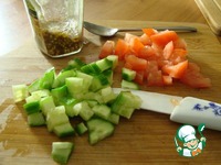 Пока делается омлет, режем половинку помидора мелко. Я семена удалила. Так же режем огурец. |