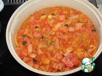 Выложить помидоры, посолить по вкусу, перемешать, тушить пару минут. |