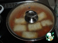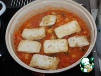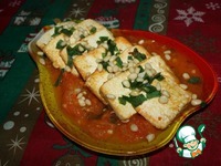 На помидоры выложить обжаренный тофу, долить немного воды. |
