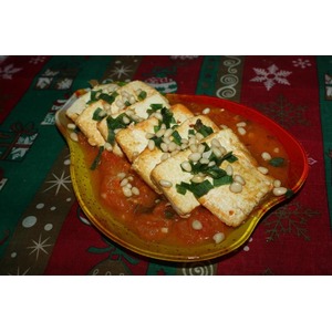 На тарелку для подачи выложить помидоры. Сверху положить тофу. Посыпать зеленым луком и кедровыми орешками. |