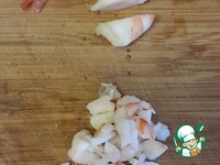 У креветок отрежьте небольшую часть, оставляя хвостики. Отрезанную часть нарежьте мелко |