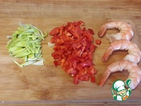 Пока варится рис, отварите креветки, нарежьте мелко лук-порей и сладкий перец |