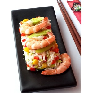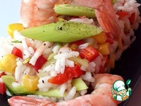 Смешайте готовый теплый рис с овощами, добавьте нарезанные креветки |