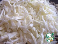 Затем добавляем нашинкованную капусту, накрываем крышкой, убавляем огонь и оставляем на 10 минут, чтобы капуста обмякла. |