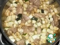 В сотейнике разогреть раст. масло, добавить кусочки курицы вместе с соевым соусом и луком. Потушить 5 минут под крышкой. Добавить цуккини (кабачок) и баклажан. |