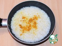 Приготовим рис. Промытый и обсушенный рис поместить в сковороду со сливочным маслом и обжарить так, чтобы рис стал матовым и пропитался маслом. |
