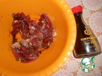 Приготовить маринад-соединить оливковое масло, соевый соус и соус табаско. Выложить мясо в маринад и оставить на 1 час. |