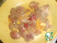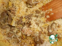 К обжаренному мясу добавить обжаренные лук с чесноком. Добавить промытый рис, посолить и приправить карри, перемешать. |