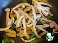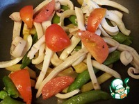 Тем временем отварите кальмаров и нарежьте их соломкой, добавьте к овощам на сковороде, хорошо прогейте |
