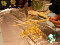 В процессе приготовления я поняла, что легче нити наматывать сразу на торт. Макаем вилку в карамель, тянем и наматываем в произвольном порядке. Чем дальше тянем, тем тоньше нити. |