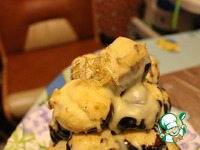 Пока профитроли пекутся приготовим крем. Мой выбор пал на зефирный крем. 6 двойных зефирок нагреть в микроволновой печи примерно 30-60 секунд. За это время зефир разбухнет и станет мягким. |