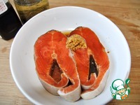 Пока варится рис, берём лосось, у меня кижуч, режем на стейки. Можно брать просто порционные куски. |