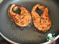 Берём маринованные стейки лосося и обжариваем на сковороде с тефлоновым покрытием без масла по 1,5 минуты с каждой стороны. Накрываем крышкой и даём рыбе дойти 5 минут. |