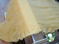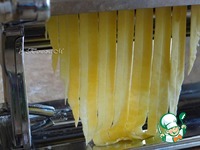 Приготовить лапшу: Яйца слегка взбить с солью, добавить муку; |