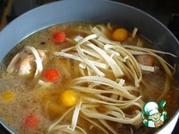 Выложить в бульон лапшу (2-3 горсти), черри, довести до слабого кипения и проварить еще 3-4 минуты; |
