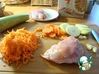 Одну морковь натираем на тёрке, вторую режем колечками. Кабачок режем вдоль "кругляшами". В бёдрышках ножом делаем "кармашки" и вставляем туда дольки чеснока. |
