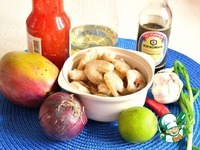Для приготовления вкусного и необычного ужина сегодня нам понадобятся - креветки, манго, красный лук, чеснок, перец чили, зеленый лук, сладкий соус чили, соевый соус и сок лайма. |