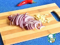 Красный лук нарежем полукольцами, чеснок мелко порубим. |