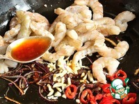 Затем добавляем перец чили, чеснок, креветки. Заливаем заправкой, перемешиваем и готовим несколько минут до того момента, когда креветки станут розовыми. Помешиваем периодически. |