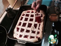От готового теста я отделила 1/4 для полосок-украшений. Остальное раскатала в прямоугольный пласт, уложила в форму и сверху выложила всю начинку. Начинку выкладываем так, что бы остались бортики. |