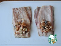 Кладём рыбную массу (по 2 ст. ложке) на пласты рыбы. Если у вас остаётся рыбный фарш, то его можно использовать, как начинку для пирогов или просто поджарить (потушить). |