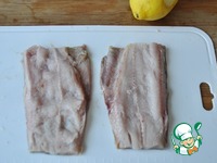 Готовые пласты рыбы придавливаем ладонью, чтобы они стали тоньше, и легче было свернуть. Сбрызгиваем соком лимона. |