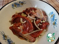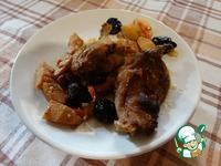 Кусочки нутрии отряхнуть от лука (лук и соевый соус не выбрасываем) и обжарить до румяной корочки. Мясо переложить в другую посуду, а на том же масле слегка обжарить морковь и лук из маринада. Вернуть мясо на сковороду к моркови и луку, сверху добавить кусочки айвы. До половины объема мяса залить водой с вином, в котором выдерживали айву и прибавить остатки соевого соуса. Тушить под крышкой 30 минут. Добавить чернослив и чеснок. Если нужно, добавить жидкость. Попробовать на соль, добавить, если нужно. В нашей семье привыкли к минимальному количеству соли, поэтому, если в блюде присутствует соевый соус, то больше не досаливаем.