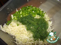 Нотовим начинку: шинкуем капусту тонко, перетираем её с солью, добавляем мелко порезанный зеленый лук и укроп. |