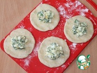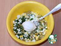 Приготовить предварительно начинку: Очищенные и сваренные яйца мелко порезать. Оливки порезать кружочками. Зелень порубить. Добавить 2 ст. л. плавленного сыра, |