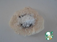 Берем немного теста, кладем на ладонь, стол или разделочную доску. По середине выкладываем шоколад и посыпаем его не большим количеством кокосовой стружки. |
