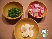 Яйца отварить, нарезать половинками, лук нашинковать, редис нарезать небольшими кусочками. Все ингредиенты смешать, заправить растопленным сливочным маслом. |