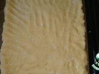 Разделить тесто на две неравные части. Меньшую часть оставить для украшения, большую часть выложить на противень (постелите пекарскую бумагу), руками сформируйте пласт. |