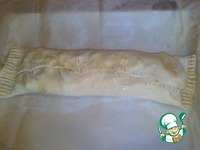 Выложить начинку на тесто и завернуть скрепляя тесто вилкой. Выложить на противень, застеленный пергаментом. Смазать сливочным маслом и отправить в разогретую до 180 град. духовку на 20 мин. |