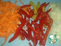 Нарезать лук и брокколи кубиками, болгарский перец - соломкой, морковь - натереть на крупной терке. |