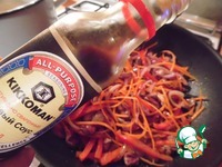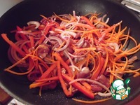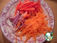 Перец и морковь нарезать соломкой, лук - полукольцами. |
