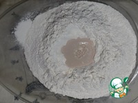 Разводим дрожжи в воде с сахаром и выливаем на просеянную муку. Добавляем оставшуюся воду с солью и замешиваем тесто. |