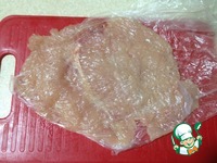 И отбить. Чтобы мясо не прилипало к молотку и не разлеталось лучше отбивать его в одноразовом пакете. |