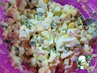 Для начинки порезать вареные яйца, крабовые палочки и лук зеленый. Солим немного, добавляем сметану и перемешиваем. |