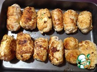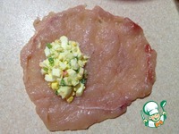 Формируем рулетики, (мясо берем мокрыми руками что-бы не прилипало) и начинки кладем не очень много, где-то чуть меньше одной столовой ложки ( так лучше закрутиться). |