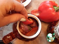 Выкладываем мясо в горшочки, добавляя в каждый небольшую веточку розмарина и пару ложек воды |
