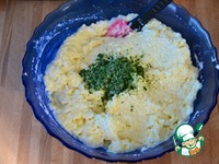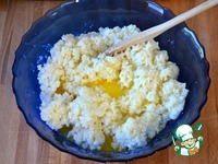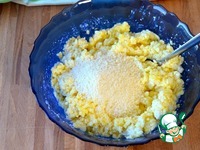 Духовку разогреть до 220 градусов. Остывший рис переложить в миску. "Разбить" его вилкой (если он схватился одним куском) или ложкой и добавить растопленное сливочное масло. Как следует перемешать. |