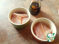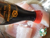 Филе режем на кусочки, соединяем со специями и заправляем соевым соусом ТМ "Киккоман". Даём помариноваться минут 15 |