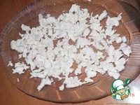 Куриную грудку отварить в подсоленной воде, остудить, порезать и уложить на блюдо |