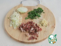 Порезать мясо (прошутто), мелко порубитьлук, чеснок, зелень Слегка поджарить лук и прошуттто |