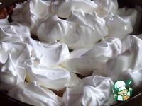 Взбить белки до тугих пиков, постепенно добавляя сахар. Ложкой по кругу выложить белковую массу на пирог. |