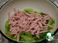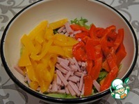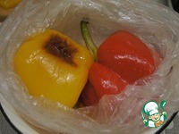 Остывшие перцы очистить от семян и кожицы и нарезать длинными полосками. Немного полосок отложить для украшения. Остальное добавить к салату. |