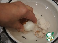 Яйцо очистить и нарезать на четвертинки. На днях увидела по телевизору совет. Оказывается, если вареное яйцо плохо чистится, надо чистить его, опустив в холодную воду. Попробовала. Помогает. |