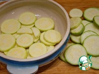 Кабачки вымыть, обсушить и нарезать очень тонкими, почти как чипсы, кружочками. Перец нарезать вдоль ни широкие полоски. |
