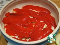 Сверху выложить половину соуса и разровнять. Затем выложить полоски перца |