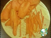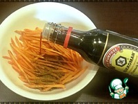 Морковь очистить, нарезать тонкими ломтиками и затем мелко соломкой. Можно морковь натереть на терке для корейской моркови. |